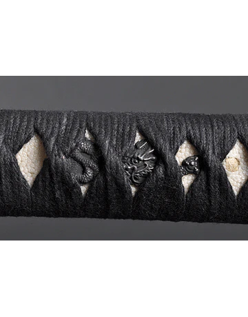 Tsuka(Mango): Madera recubierta de piel genuina (rayskin) y luego envuelta en el tradicional patrón de diamante con algodón negro Ito y ornamentada con Menuki;