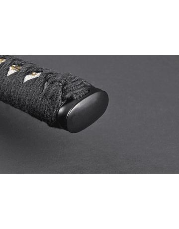 Tsuka(Mango): Madera recubierta de piel genuina (rayskin) y luego envuelta en el tradicional patrón de diamante con algodón negro Ito y ornamentada con Menuki;